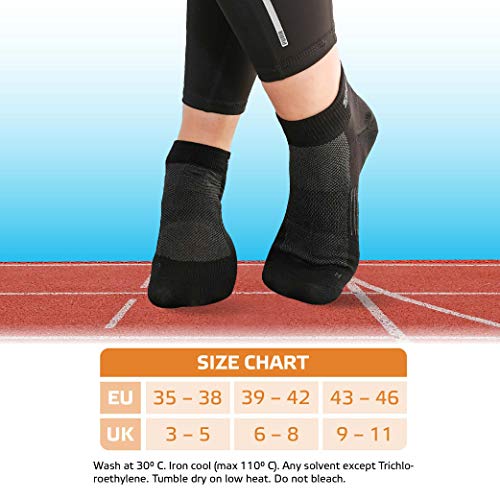 CALZE COMPRESSIONE CONTRO L'UMIDITÀ: Il tessuto innovativo aiuta a prevenire efficacemente il sudore. I filati morbidi e traspiranti assicurano comodità e piedi sempre asciutti. Le nostre calze rimangono fresche e leggere anche dopo un lungo allenamento. Sono adatte a qualsiasi condizione atmosferica grazie alla loro capacità di regolazione della temperatura: mantengono i piedi caldi in inverno e freschi in estate. Prevengono odori e problemi di salute.
