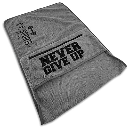 C.P. SPORTS - Asciugamano fitness in microfibra, fissaggio + borsa con chiusura lampo, per palestra, allenamento, sport, extra morbido, lavabile, lungo e grande, unisex, colore: grigio chiaro