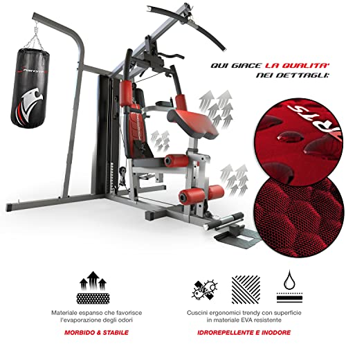 - Questo attrezzo multifunzione palestra include polsini per le caviglie, una barra per le trazioni, una barra per le trazioni lat e un poster di allenamento completo! Potete anche godervi una sessione di boxe con il vostro palestra a casa installando un sacco da boxe su HGX250 e HGX200.