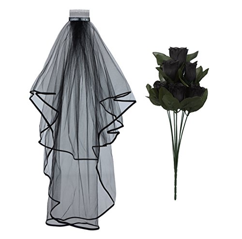 Velo gotico. La fascia a velo nero si fissa in posizione con il pettine di plastica attaccato. Il mazzo di finte rose nere è leggero e rende grande il giorno dei morti con il velo nero di Halloween.