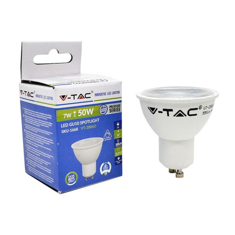 LED Spotlight 7W GU10 Plastica Lens 6000K Dimmerabile 38° SKU: 1668: VT: VT-2886D Caratteristiche del prodotto 80% di consumo energetico in meno rispetto alle lampadine standard Lunga durata Nessuna emissione di radiazioni UV e radiazioni non ionizzanti Accensione immediata, nessun tempo di riscaldamento Bassa potenza termica Direttamente sostituibile alle lampade ad incandescenza tradizionali Installazione Aree Commerciali e Residenziali Hotel, Bar Stand espositivi Lampadari Allaperto, esclusivamente allinterno di apparecchi idonei. Specifiche tecniche Informazione generale Attacco GU10 Tipo Lampadina PAR16 Tipo LED SMD Vitamedia 20 000 ore Dati elettrici Potenza 7W Potenza EQV. a incandescenza 50W Tensione AC:220-240V Frequenza 50Hz Fattore di potenza >0.5 Dati tecnici luce Fascio Luminoso 38° Colore della luce Bianco Temperatura di colore 6000K Flusso luminoso (lm) 550 lm Indice di resa cromatica Ra >80 Dettagli corpo Materiale Plastica Funzionalità IP Protezione IP20 Dimmerabile