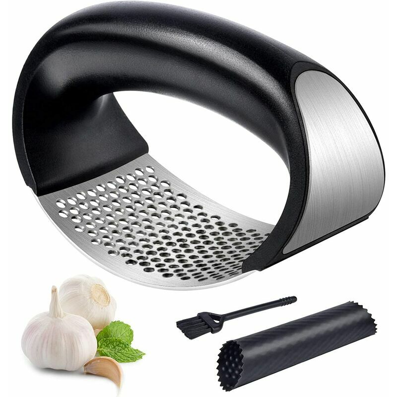 Questo spremiaglio è realizzato in plastica ABS per uso alimentare e acciaio inossidabile 304 di alta qualità. Il suo design ergonomico e confortevole rende la spremitura dell'aglio molto più facile e veloce, anche per le persone con una presa debole o mani piccole. Il nostro spremiaglio è uno strumento da cucina unico. La superficie arcuata del manico offre una buona presa. Può essere utilizzato facilmente da persone anziane e utenti inesperti. Goditi il tuo tempo di cottura con questo taglia-aglio! Facile da usare e da pulire in pochi secondi: il design leggero ed ergonomico lo rende più facile e comodo da usare, risparmiando tempo per tagliare e tagliare l'aglio. Il design ti consente per pulire facilmente lo spremiaglio semplicemente sciacquandolo sotto l'acqua corrente o lavandolo in lavastoviglie. Spazzola per la pulizia inclusa. e una spazzola per la pulizia. Il pela-aglio ti aiuterà a rimuovere la pelle dall'aglio con un movimento rapido, senza doverlo toccare direttamente e