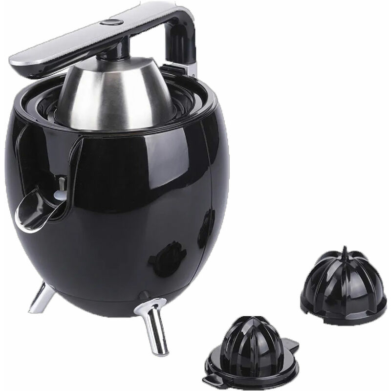 Corpo principale in pp. a 2 coni: cono grande per arance e pompelmi, cono piccolo per limoni. impugnatura in alluminio pressofuso, pressa in acciaio inossidabile. piedini cromati antiscivolo. beccuccio anti-gocciolamento in acciaio inossidabile. smontabil
