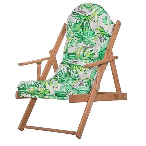 CARATTERISTICHE: Lettino da giardino in legno massiccio con imbottitura fissa a motivo Monstera, schienale regolabile su 3 livelli, dimensioni del lettino: 71 x 90 x 103 cm.