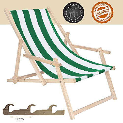 PARAMETRI: sdraio direttamente dal produttore nell'UE, stabile struttura in legno di faggio, non verniciata, sdraio con braccioli, regolazione a 3 livelli, peso proprio: 4 kg, carico massimo fino a 120 kg, tessuto saldamente montato
