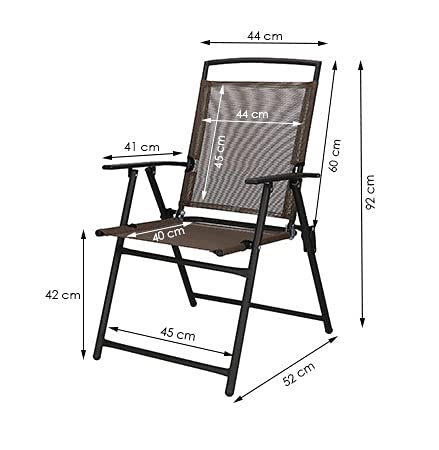 Dettagli: sedia da giardino con schienale color marrone. Materiale: metallo, tessuto textilene. Altezza: 92 cm. Larghezza: 57 cm. Profondità della seduta: 45 cm
