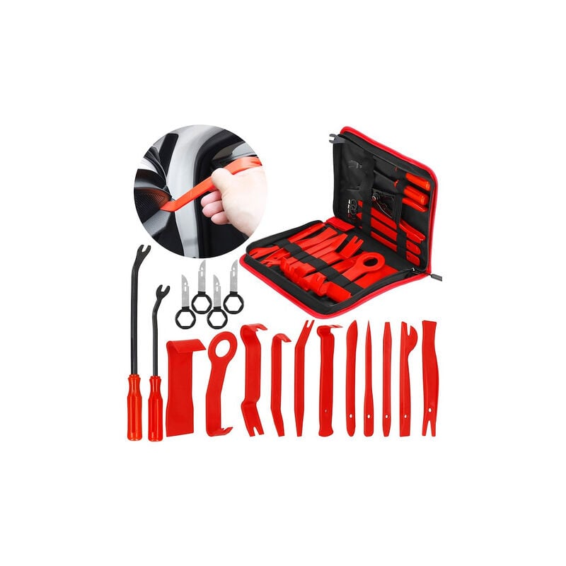 È possibile smontare in modo sicuro il rivestimento e non graffiare le delicate superfici dell'auto? Certamente! Per eseguire questo compito saranno necessari solo degli estrattori speciali per tappezzeria. Questi strumenti hanno forme appositamente sagomate e funzionano secondo il principio della leva. Sollevando il rivestimento, non danneggerai gli elementi morbidi o i fermagli della tappezzeria. Riceverai un set completo di 18 strumenti che ti permetteranno di svolgere varie lavorazioni. Gli estrattori possono essere comodamente riposti nella custodia inclusa nel kit. Questa custodia ha 28 scomparti, che permettono di mantenere tutto in ordine. Gli estrattori per tappezzeria saranno utili in qualsiasi officina o servizio automobilistico, tappezzeria, carrozzeria o verniciatura. Applicazioni degli strumenti: per riparare pannelli tappezzati, sistemi stereo, impianti elettrici, per smontare guarnizioni, cruscotti, fermi di plastica, per estrarre radio, contachilometri o navigazione