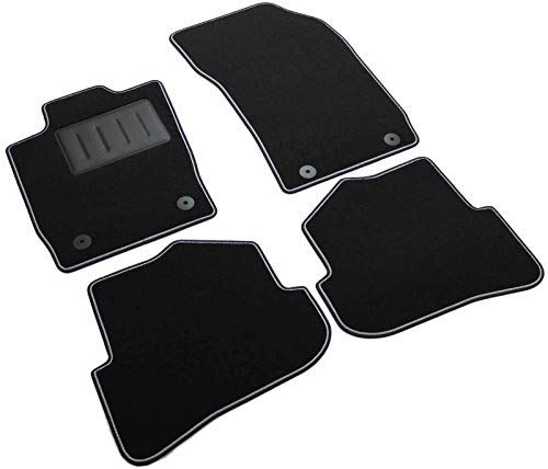 Bordatura perimetrale in tessuto bicolore nero con rigolo grigio chiaro, dotato di strap antiscivolo su tutto il perimetro del tappeto e su tutti i pezzi che forma il set della vostra auto