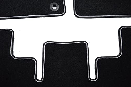 Bordatura perimetrale in tessuto bicolore nero con rigolo grigio chiaro, dotato di strap antiscivolo su tutto il perimetro del tappeto e su tutti i pezzi che forma il set della vostra auto