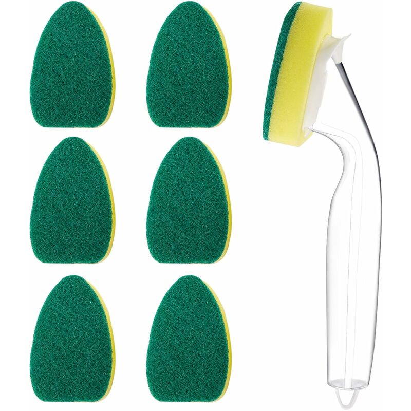 1 spugna bacchetta e 6 robuste teste di ricarica in spugna bacchetta per la pulizia del lavello della cucina Praticità: Questa è una spazzola elegante con 6 testine che puoi cambiare in qualsiasi momento senza dover riacquistare la spazzola per evitare di sprecare la bacchetta abrasiva. Materiali: Realizzato in spugna e plastica resistente, ha una lunga durata e un bellissimo effetto detergente. Il pratico strumento difficilmente ti deluderà dopo averlo usato. Metodo d'uso: Vieni a sostituire il nuovo modo senza doverti sporcare le mani. Hai solo bisogno di mettere il liquido detergente nel tubo e coprirlo. Durante il processo di pulizia, il liquido penetrerà nella testina della spazzola senza sprecare il liquido detergente in eccesso. Ampio utilizzo: È possibile utilizzarlo in molti luoghi come cucina, camera da letto, soggiorno e la maggior parte dei luoghi necessari per la pulizia. È così utile che puoi fare le pulizie con meno sforzo. Specifica: Dimensioni: 25,5 x 5 x 4 Colore