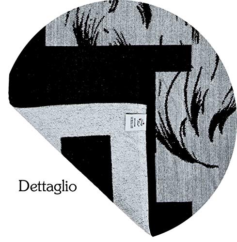 Un telo mare in puro cotone dal buon peso il cui disegno non e' stampato ma creato grazie alla lavorazione jacquard. Un intreccio di 2 tonalita', il nero e il perla che creano, in un gioco di contrasti, la scritta e la faccia di un leone in primo piano.