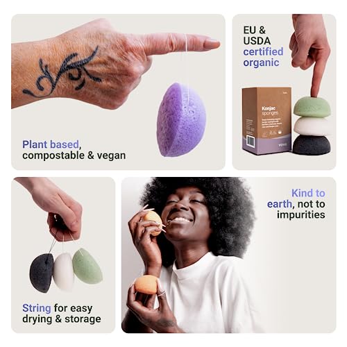 Vove | Spugna Konjac Premium Biologica | Confezione da 3 | Biodegradabile e Eco-Friendly | Carbone Attivo e Argilla Francese | Esfoliante Viso Delicato | Adatta a Tutti i Tipi di Pelle |