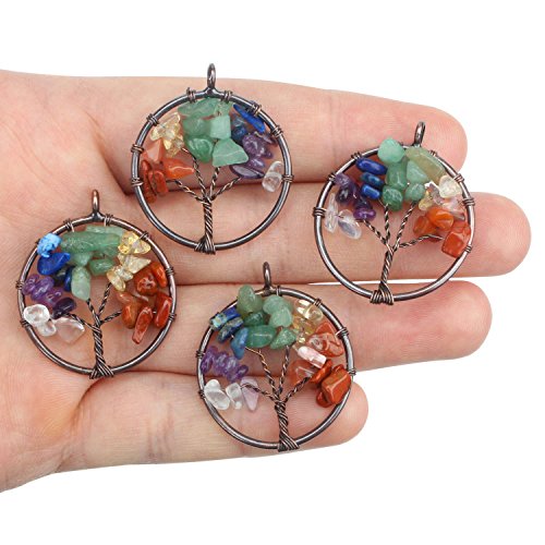 SPUNKYCHARMS All' ingrosso 4 pezzi ciondolo a forma di albero della vita di quarzo naturale 7 chakra, colore argento ciondolo tondo per creazione di gioielli Antique Copper
