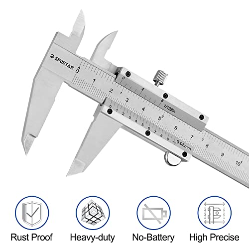 Alta precisione: Il calibro a corsoio Spurtar è uno strumento di misura ad alta precisione con una deviazione di soli 0,05 mm, disponibile sia in scala metrica che imperiale con un campo di misura di 0-6 pollici (0-150 mm). Sulla parte superiore del calibro è presente una vite di bloccaggio per evitare che i dati si spostino e cambino in caso di necessità.