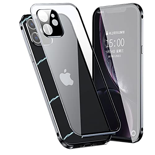 SQING Cover per iPhone 12 Magnetico Custodia,Protezione Completa del Corpo a 360 Gradi[con Obiettivi della Fotocamera Cover] Bumper in Metallo e Trasparente Vetro Temperato Case,Nero