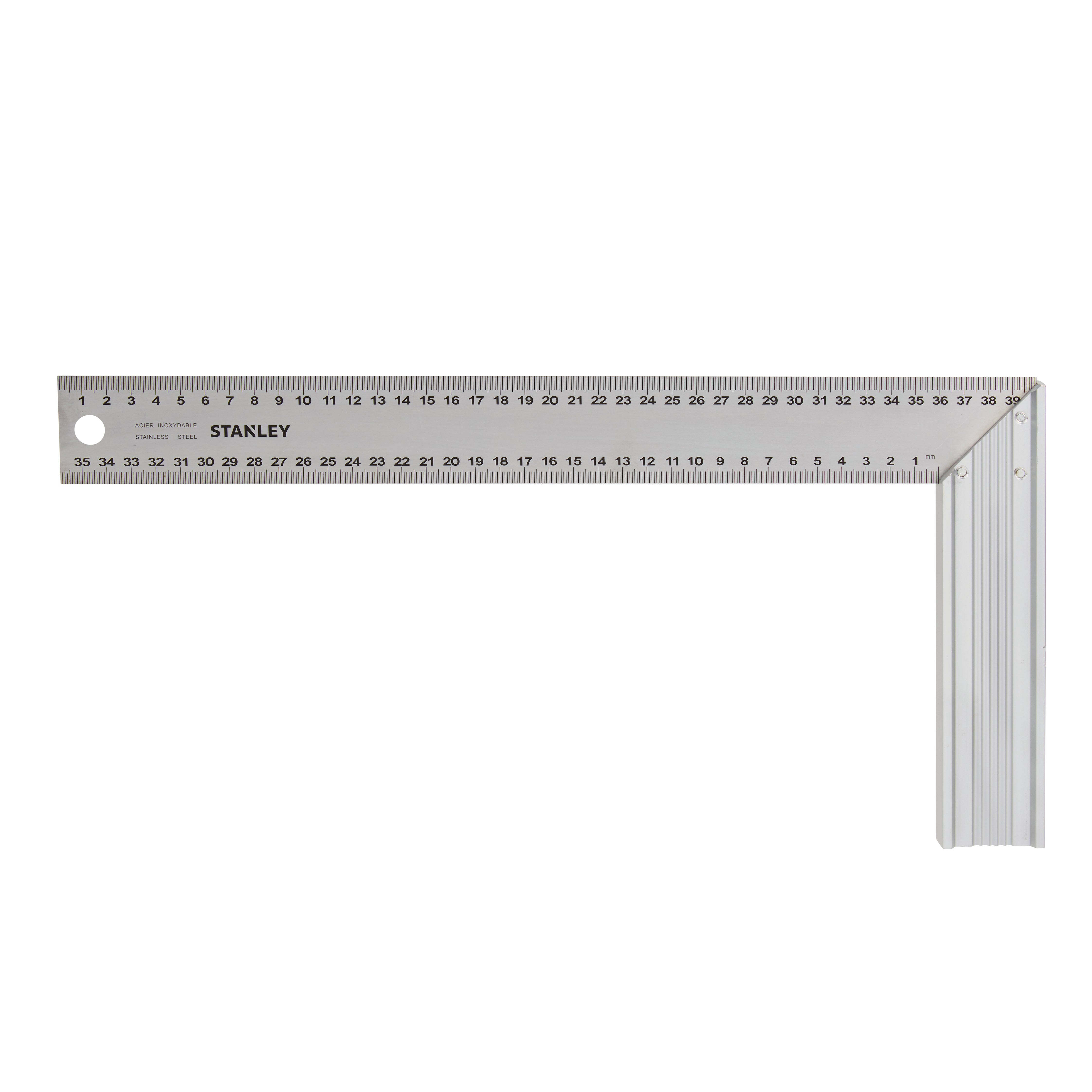 Squadra per falegnami. Lama in acciaio inox graduata in mm sui 2 lati, lunghezza 400 mm, larghezza 200 mm. Base a 45° in alluminio pressofuso