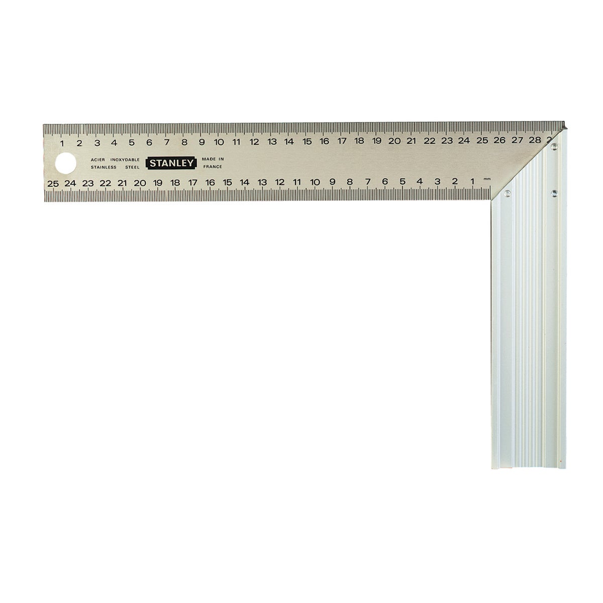 Squadra per falegnami. Lama in acciaio inox graduata in mm sui 2 lati,, lunghezza 250 mm, Larghezza 140 mm. Base a 45° in alluminio pressofuso