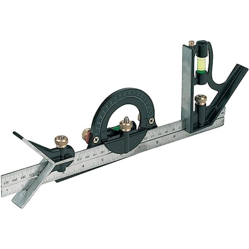 Squadra multiuso per uso venire Squadra tri, marcatura e profondimetro, Squadra un mitra e bordo dritto. Lama in Acciaio inossidabile, di 300 millimetri segnato in graduazioni metriche e imperiali. Pressofuso di alluminio Goniometro e testa centrata. 300 mm