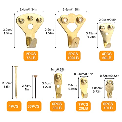 Set di ganci per appendere le immagini: il set da 64 pezzi include 37 chiodi e 27 ganci per cornici in 6 dimensioni, tra cui 4,5 kg (6 pezzi), 9,1 kg (7 pezzi), 13,6 kg (6 pezzi), 22,7 kg (4 pezzi), 34 kg (2 pezzi).