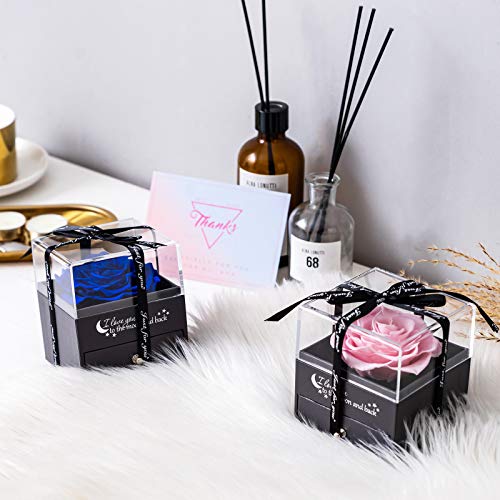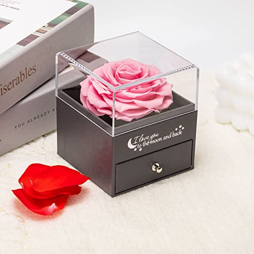 [DESIGN INCANTEVOLE DI REGALI SPECIALI]: una rosa stabilizzata abbinata a una collana di temperamento che disegna una forma di cuore creativa e romantica. C'è un piccolo cassetto con una collana a cuore all'interno, la confezione regalo rosa lo rende un bellissimo regalo di lusso, può anche essere usato come scatola per anelli.