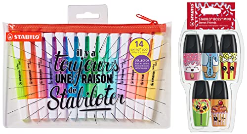 Stabilo Evidenziatore Swing Cool Trousse Con 14 Evidenziatori: 8 Fluo + 6 Pastel Edizione Limitata & Evidenziatore Boss Mini Sweet Friends Astuccio Da 5 Rosa, Blu, Giallo, Verde, Arancione
