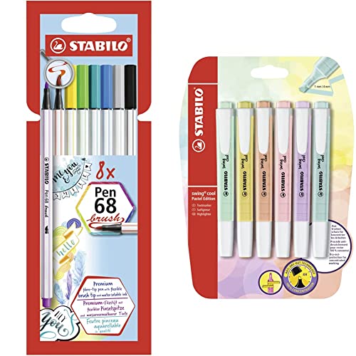 Stabilo Pennarello Premium con punta a pennello per linee spesse e sottili Pen 68 brush & Evidenziatore swing cool Pastel Pack da 6 Colori assortiti