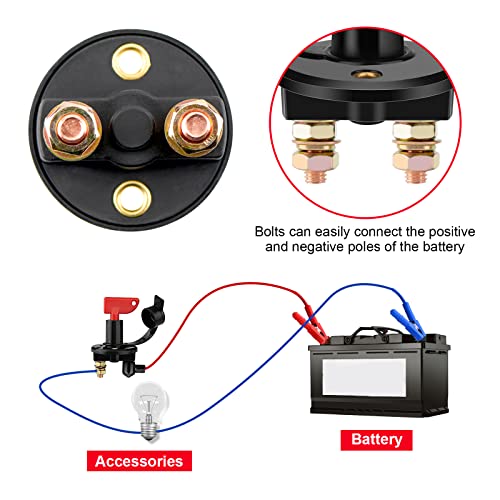 【Ampia Applicazione】L'interruttore di sicurezza è ampiamente usato per auto, veicoli, barche, yacht, camper, caravan, camion, banche di batterie e altri dispositivi 12V/48V. Può essere usato come chiave per aprire vari dispositivi elettrici, come troboscopio, assetto e fari fendinebbia che vengono utilizzati sia all'interno che all'esterno. Interruttore principale della batteria 12V 24V veloce, ideale per mantenere la carica della batteria nel tempo.