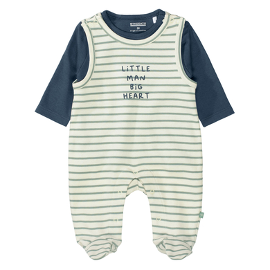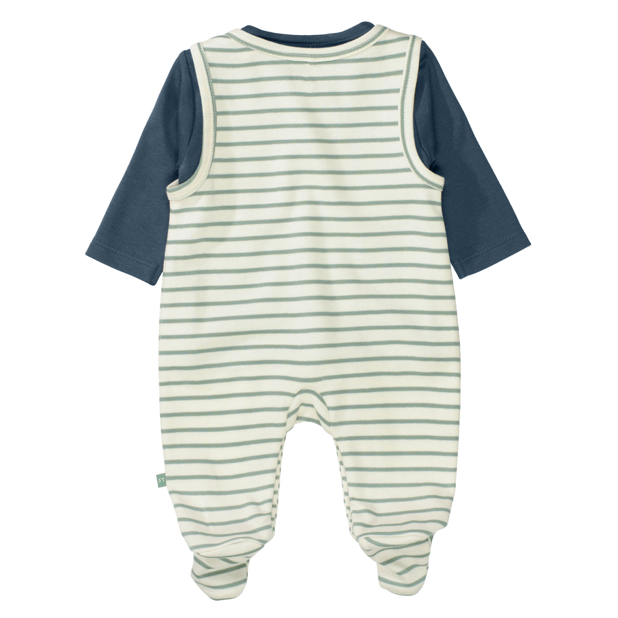 Dettagli del prodotto: Combinazione tutina e camicia tutina a righe Design Camicia a maniche lunghe unicolore Collo rotondo Bottoni a pressione sulla spalla e sul cavallo Materiale e istruzioni per la cura: 100% cotone organico Lavabile a 30° C Asciugatura con carico termico ridotto Non candeggiare Non lavare a secco