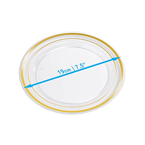 STACKABLES Confezione da 20 piatti in plastica rigida, piatti tondi e trasparenti con doppio bordo dorato, multiuso, riutilizzabili, per matrimoni, feste, catering e picnic, 19 cm