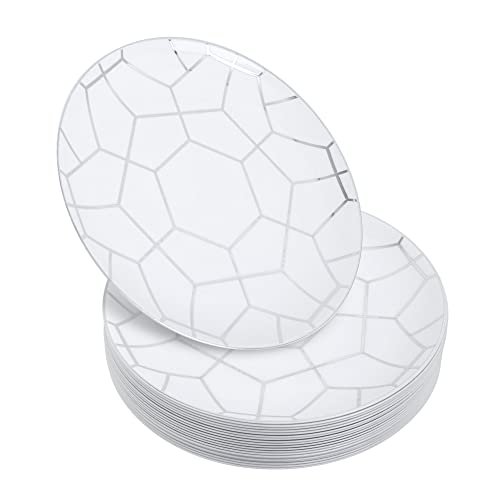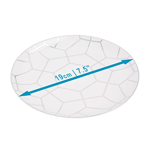 Stackables - Confezione da 20 piatti in plastica dura, piatti tondi multiuso riutilizzabili per matrimoni, feste, catering e picnic (bianco/argento, piatti da 19,1 cm)