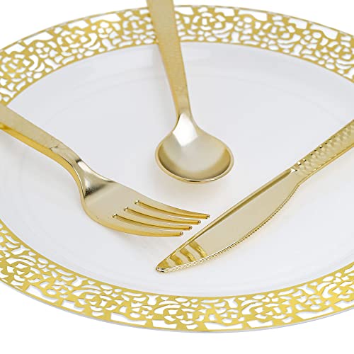STACKABLES Servizio da tavola, 100 pezzi, con piatti bianchi con bordo dorato con motivo pizzo e posate in plastica rigida riutilizzabile, per feste, set per 20 persone