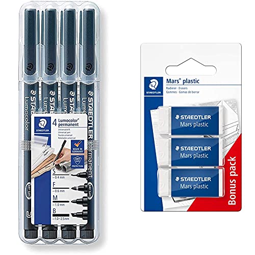 Staedtler Set Pennarelli Indelebili Neri Lumocolor Permanent Marker, Confezione Da 4 Pennarelli Con Punte E Tratti Diversi, 31-9Wp4Gs & Mars Plastic 526 53 Gomma, 40 X 19 X 13 Mm, Confezione Da 3