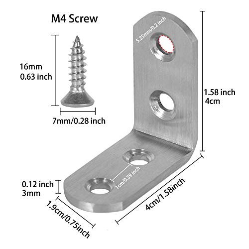 Dimensioni della staffa: 10 staffe angolari di 4 x 1,9 cm. Spessore: 3 mm. Diametro del foro: 5,25 mm. Dimensioni della vite M4: 16 x 7 mm.