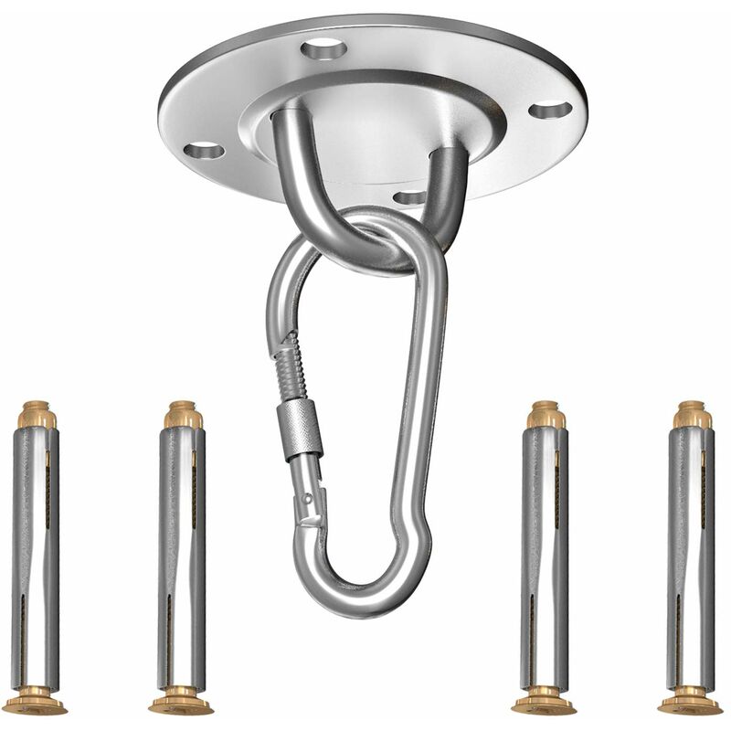 Colore come mostrato Dimensioni: 10,5 x 10,5 x 7 cm Peso: 400 g Dimensioni: Diametro staffa: 9 cm. Altezza totale 9 cm. La capacità di carico è di circa 300 kg. Può sopportare facilmente il peso di adulti o bambini. Alta qualità: il gancio da soffitto è realizzato in acciaio inossidabile 304 di alta qualità ed è antiruggine. Saldature a punti robuste e completamente saldate. Non facile da rompere o allentare, resistente e durevole. Ampia gamma di usi: È perfetto per appendere sedie ad amaca, altalene, amache, sacchi di sabbia, dondoli, cestini per altalene, imbracature, asciugamani per lo yoga e altro ancora. Nota: Fissaggio solo su soffitti in cemento con il materiale di fissaggio incluso. Non adatto per soffitti in cartongesso, pareti in argilla o altri materiali da costruzione morbidi.