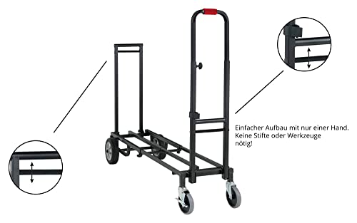 Ruote posteriori (larghezza x diametro): 5 cm x 20 cm (con cuscinetti a sfera), portata massima: 150 kg, tubo quadrangolare: 25 x 25 mm, gomma antiscivolo sul piano di carico