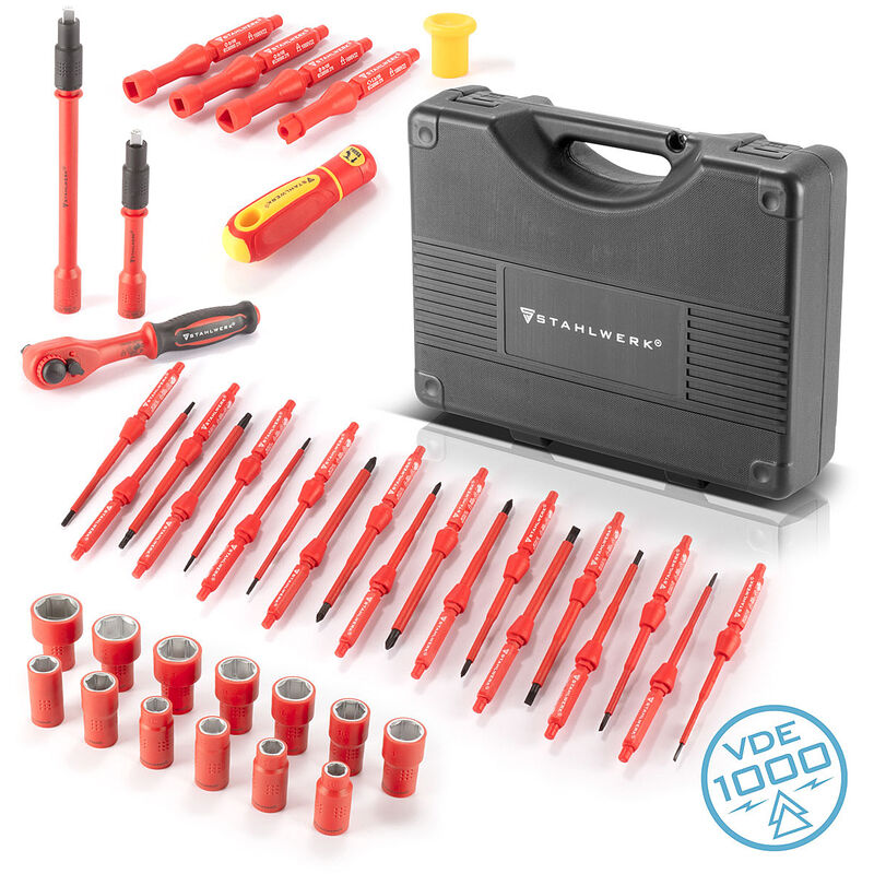Caratteristiche Il set di cacciaviti e prese STAHLWERK con isolamento VDE da 41 pezzi è l'attrezzatura ideale per tutti i lavori elettrici in casa, come ad esempio su prese, computer, elettrodomestici, auto elettriche e ibride, ecc. Grazie all'isolamento protettivo VDE, il set di cacciaviti a cricchetto è adatto anche a lavori sotto tensione sicuri fino a 1.000 V. L'utensile professionale per elettricisti comprende un set di 25 pezzi di cacciavite/chiave per armadietti VDE e un set di 16 pezzi di cricchetto per chiavi a bussola VDE. Tutti i cacciaviti sono dotati di punte magnetiche. Questo impedisce alle viti di staccarsi e consente un fissaggio facile ed efficace. Dati tecnici Modello: STAHLWERK Set di cacciaviti e bussole isolati VDE 1000V VSS-41 ST Materiale: plastica / acciaio Standard: DIN EN 60900 IEC 60900 Dimensioni della valigetta (LxPxH): 35,5 x 25,5 x 8,5 cm Peso totale: 2,4 kg Contenuto della fornitura 1 x valigetta di trasporto Set di 25 pezzi di cacciaviti VDE e chiavi