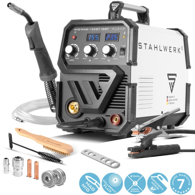 Saldatrice ad arco a gas MIG/MAG con funzione di saldatura ad elettrodo MMA. Moderna tecnologia IGBT - potente 155 A con elevato ciclo di funzionamento . Filo animato /FLUX adatto, alimentazione automatica del filo, induttanza e tensione regolabili. Molti extra: raffreddamento ad alte prestazioni e protezione contro il surriscaldamento, Hotstart, Anti-Stick, accensione HF e molto altro ancora Acquistare direttamente dal produttore - 7 anni di garanzia* secondo §13 Condizioni generali di contratto (per le Condizioni generali di contratto cliccare sul nome del venditore) su saldatrici, taglierine al plasma, compressori, cassette filtro e caricabatterie per auto, consulenza telefonica, supporto tecnico e assistenza anche al di fuori del periodo di garanzia. Test sui prodotti, prove di saldatura, prove di taglio in azienda - convincetevi della nostra alta qualità e del nostro servizio clienti unico nel suo genere. Convinzione attraverso un'eccellente qualità di saldatura! Perfetto per i