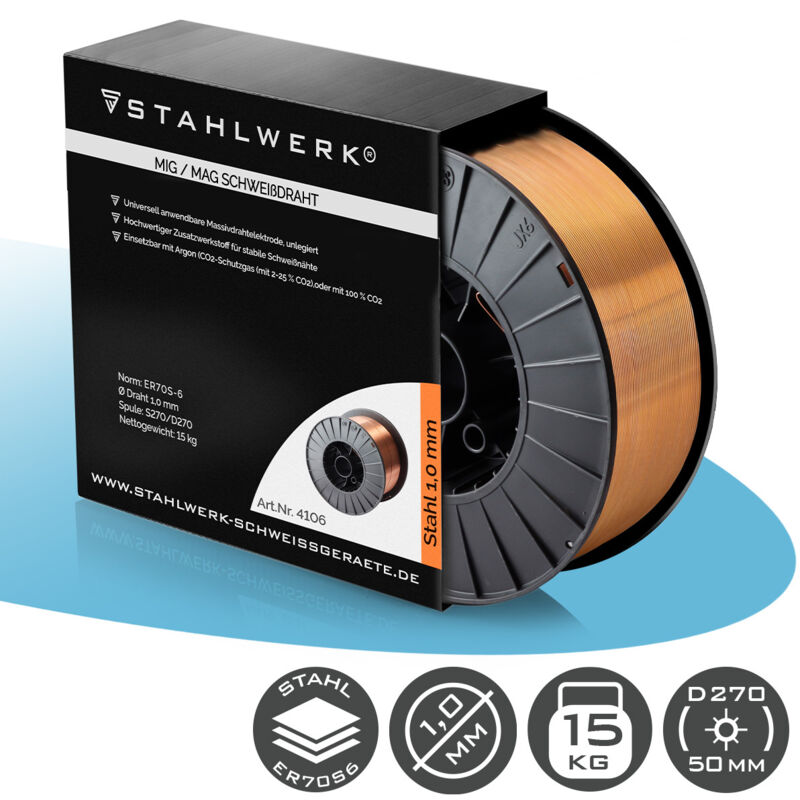 STAHLWERK MIG MAG premium filo per saldatura ER70S-6 SG2 1,0 mm bobina di filo da 15 kg Filo per saldatura STAHLWERK MIG MAG premium ER70S-6 SG2 1,0 mm, utilizzabile universalmente, in bobina da 15 kg con supporto da 50 mm. Materiale d'apporto di alta qualità per cordoni di saldatura stabili. Caratteristiche Filo per saldatura SG2 di alta qualità da 1,0 mm per dispositivi MIG MAG con porta bobina da 50 mm. Elettrodo a filo pieno universale, non legato. Materiale d'apporto di alta qualità per cordoni di saldatura stabili. Può essere utilizzato con gas di protezione argon / CO2 con il 2-25% di CO2 o con il 100% di CO2. Composizione chimica migliorata per risultati di saldatura ancora migliori. Bassi spruzzi grazie all'elevata purezza chimica per risultati di saldatura ottimali. Materiale d'apporto di alta qualità per cordoni di saldatura stabili. Standard: ER70S-6 Diametro bobina: S270/D270 Contenuto della fornitura 1 x STAHLWERK MIG MAG premium filo per saldatura ER70S-6 SG2 1,0 mm