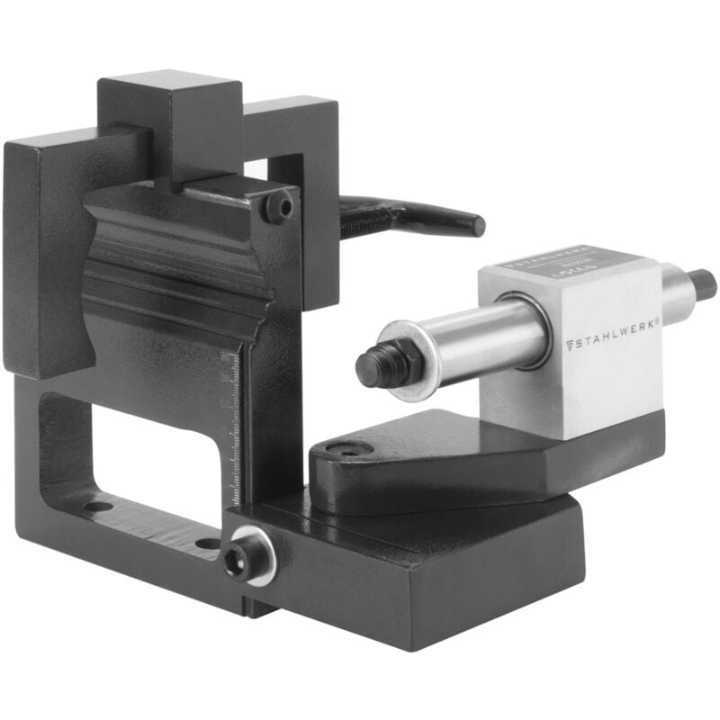 La STAHLWERK RA-50 ST è una macchina di precisione per la realizzazione di intagli su tubi metallici. Nel robusto dispositivo di serraggio dell'intagliatore di tubi, è possibile fissare tubi metallici fino a un diametro di 80 mm (3) tramite una leva di serraggio con una potente filettatura del mandrino. La gamma di serraggio del prisma di serraggio fresato e temprato copre tubi di larghezza compresa tra DN 20 (3/4) e DN 80 (3). Le tacche nel tubo sono realizzate con una sega a tazza. Il perno di guida della sega a tazza è inserito in cuscinetti a rullini in un blocco di guida e montato su un supporto utensile stabile. Il supporto stabile dell'utensile e il cuscinetto a rullini con gioco fine consentono un lavoro preciso durante l'intaglio dei tubi. Caratteristiche Intagliatore professionale per lavori precisi su tubi metallici con diametro nominale fino a 80 mm Angolo di taglio liberamente regolabile da 0°-50° gradi Struttura robusta in metallo e portautensili con cuscinetto ad aghi