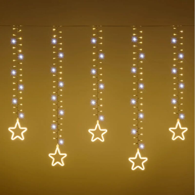 Questa stalattite si compone di 350 MiniLed Ø 3 mm + 580 led SMD neon. La luce emessa dai 350 led fissi bianco caldo e flashing freddo di questa stalattite si diffonde su 3 metri di larghezza. Le calate, distanti 30 centimetri l'una dall'altra, hanno lunghezze diverse (75 e 95 cm). Lungo tutta la stalattite sono posizionati alcuni FlashLed a luce fredda, che emettono una luce a intermittenza. L'effetto è automatico e non si può disattivare. La particolarità di questa stalattite è la presenza di 10 stelle (15 cm di diametro) SMD neon bianco caldo ultraluminose, perfette per poter abbinare la tua stalattite ad altre figure luminose. La comodità di questa stalattite risiede anche nel fatto che dispone di un cavo soft trasparente progettato per evitare di aggrovigliarsi. Questa decorazione non è prolungabile. Dettagli 3 x 0,95 m, 930 led, cavo soft bianco 10 stelle SMD neon Effetto flashing Non prolungabile Trasformatore incluso Cavo di alimentazione 4 m incluso Uso interno ed esterno