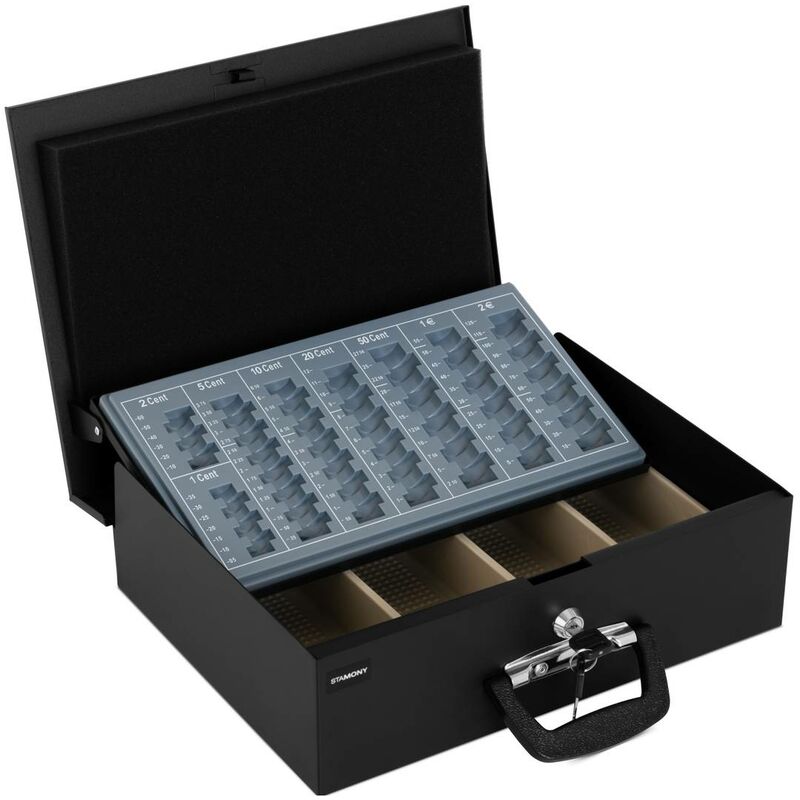 Cassetta porta soldi ST-CB-105 di Stamony Il disordine della cassa del tuo negozio deve finire? Con la cassetta porta soldi chiudibile a chiave ST-CB-105 dall'attrezzatura per l'industria di Stamony puoi organizzare in un attimo grandi quantità di monete e banconote e metterli al sicuro da accessi non autorizzati grazie ai suoi inserti estraibili: che sia per uno studio medico, uno stand al mercato, per casa oppure per l'ufficio. Nel pratico contamonete con le sue 8 colonne puoi dividere monete (in euro) da 1 Cent fino a 2 euro. Grazie alla scala riconosci subito quante monete si trovano nella cassa e potrai dare il resto in modo facile e controllato. Questo evita errori quando si cambiano i soldi e permette di risparmiare prezioso tempo di lavoro quando devi contare i soldi. Quando si apre il coperchio della cassetta porta denaro, lo scomparto per monete viene spinto in posizione leggermente inclinata come per magia, cosa che rende più facile la rimozione delle monete. Nei quattro