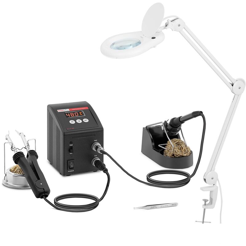 Stazione di saldatura S-LS-48-SET di Stamos Soldering La stazione saldante S-LS-48 è dotata di un saldatoio e una pinzetta ed è, quindi, un dispositivo estrememente versatile con cui possono essere montati velocemente e in modo preciso soprattutto componenti SMD. Per un utilizzo sicuro, la stazione saldante digitale è dotata di una funzione ESD. Nel set è inclusa anche una lampada LED che offre una visuale ideale per tutti i lavori più delicati. La stazione di saldatura include un alimentatore controllabile digitalmente che può essere utilizzato per regolare il saldatore con una potenza di 80 W e le pinzette. La temperatura può essere impostata in modo esatto tra 200 e 480 °C tramite il display LED. Dettagli tecnici Stazione di saldatura S-LS-48 Tensione 230 V Potenza 80 W Saldatoio intervallo di temperatura 200 - 480 °C Intervallo di temperatura pinzette SMD 200 - 450 °C Resistenza alla temperatura ± 5% a 400 °C Tempo di riscaldamento Circa 40 s (400 °C) Corrente nominale 0,5 A