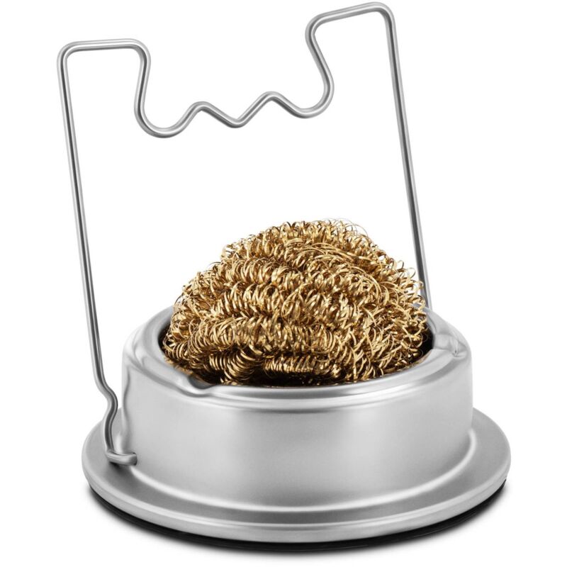 Supporto per saldatore con spugna metallica S-LS-53 di Stamos Soldering Il supporto per saldatore di Stamos Soldering rende il tuo lavoro estremamente semplice. Il supporto con spugna per saldatura offre sia una possibilità di conservazione sicura del saldatore sia una pulizia accurata della punta di saldatura, è quindi un utile complemento per officine elettriche, nell'artigianato oppure per l'uso privato nell'elettronica o modellismo. La spugna metallica è costituito da una spugna in ottone. Ciò garantisce una pulizia accurata della punta di saldatura senza che sia necessario inumidirla e senza abbassare la temperatura di esercizio. Il saldatore è pronto per l'uso in qualsiasi momento e grazie alla sua punta pulita funziona con un trasferimento di calore perfetto. Le dimensioni compatte e il peso ridotto rendono facile posizionare il supporto per saldatore ovunque sia necessario per lavorare comodamente. Grazie al supporto in gomma antiscivolo, la robusta struttura in acciaio
