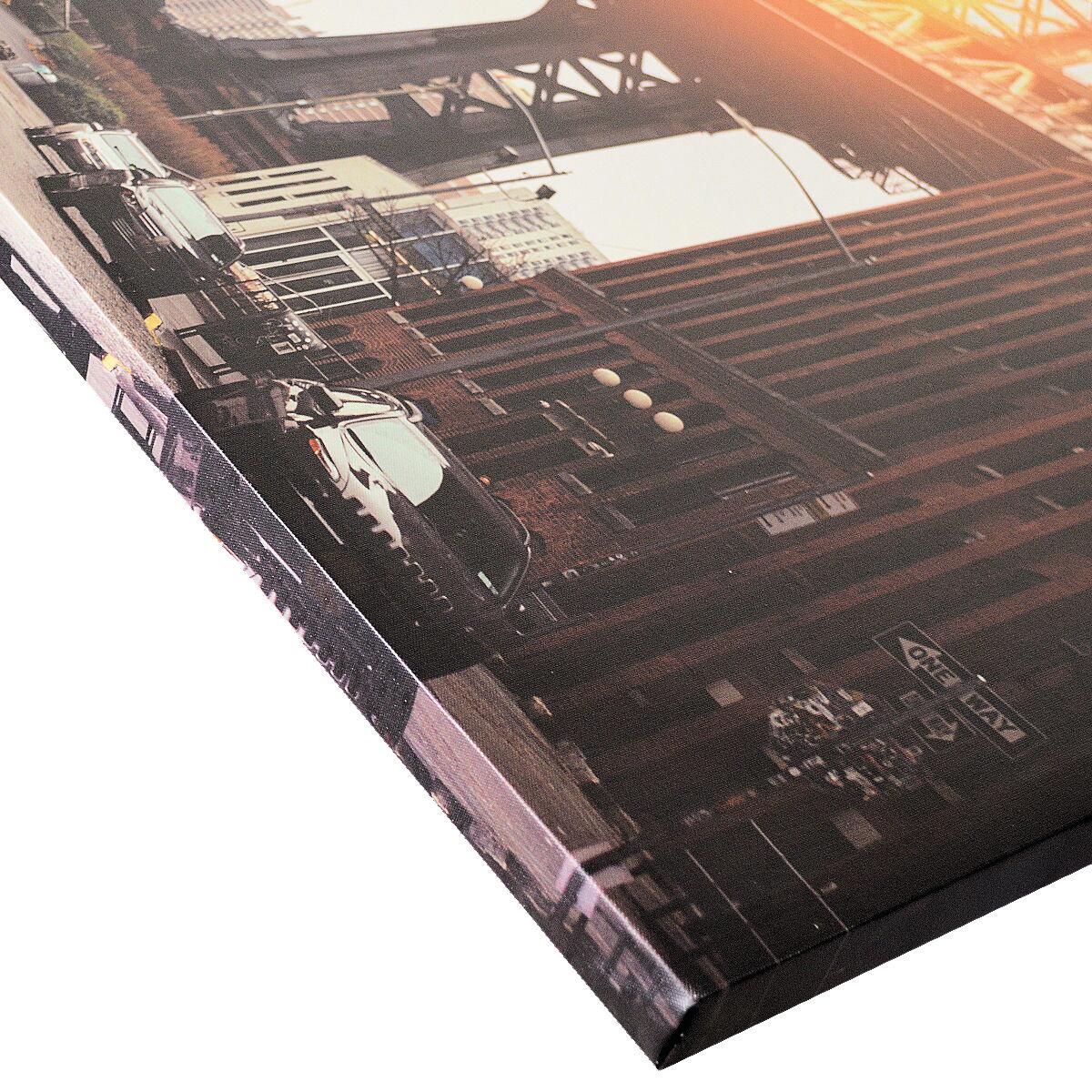 Quadro stampato con il ponte di Manhattan al tramonto osservato da una strada cittadina. Telaio in legno di abete certificato FSC.