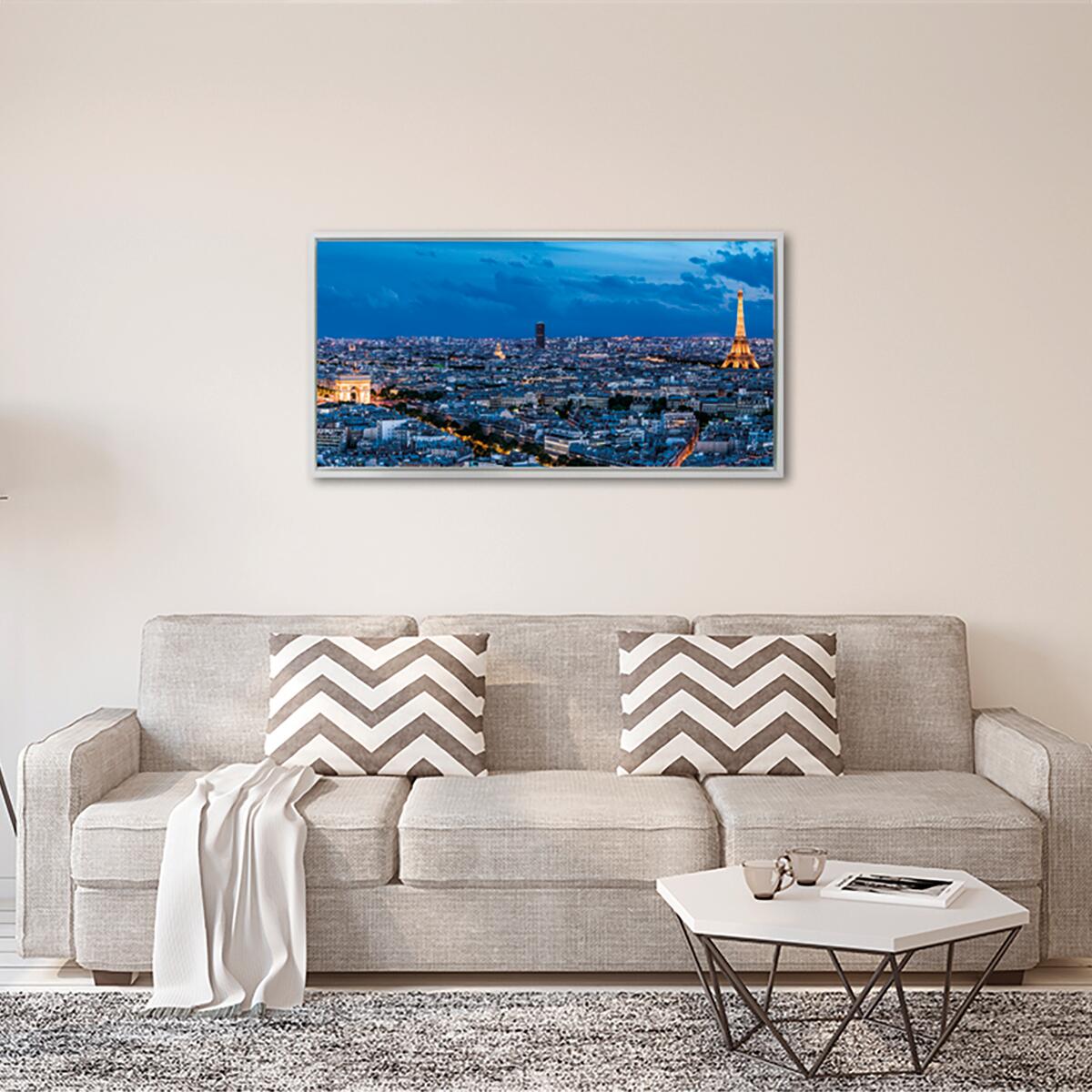 Quadro su tela con cornice Sophia, Panorama di Parigi con Torre Eiffel illuminata, dimensione esterna 67x127, dimensione immagine 60x120