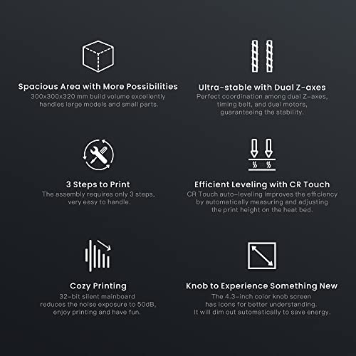 【300 x 300 x 320 mm di grande volume di costruzione】Con il grande volume di costruzione di 300 x 300 x 320 mm e una camera di stampa aperta, sarai in grado di stampare facilmente modelli 3D di grandi dimensioni oppure puoi stampare diversi piccoli modelli in stesso tempo sulla grande superficie di costruzione.