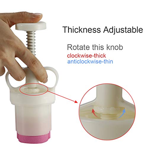 Viene fornito con 2 francobolli (circa 1,7 pollici di diametro) con vari di modello, è possibile regolare l'altezza dello stampo ruotando la manopola sul manico per rendere diverse dimensioni di biscotti o mooncakes.