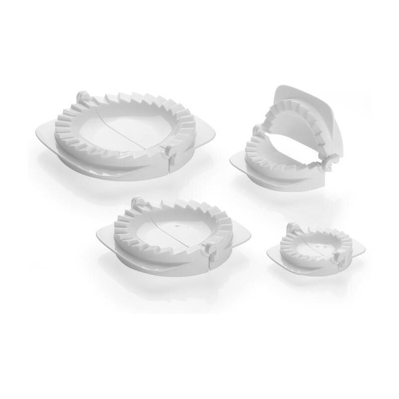 Se vuoi dare un aspetto armonioso ai tuoi panzerotti questo utensile ti aiuta a tagliare e a chiudere la pasta ottenendo una deliziosa e perfetta forma a mezzaluna in pochissimi minuti. Il set è formato da quattro pezzi con diametro 6 8 10 e 12 cm. Usali anche per preparare i ravioli o dei fagottini di sfoglia dolci! Specifiche dello stampo panzerotti Forme per ravioli Ideale per preparare anche panzerotti ravioli fagottini sofficini Prodotto in plastica resistente Lavabili in lavastoviglie Dimensioni: ø 6 8 10 e 12 cm EAN 8595028427608