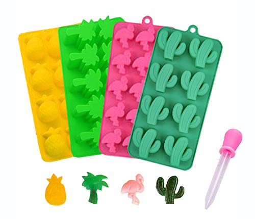 Stampo in silicone per caramelle a forma di cactus, fenicottero, palma da cocco e ananas, per realizzare caramelle, gelatina, cioccolato, cubetti di ghiaccio, confezione da 4 stampi con 1 contagocce Multi