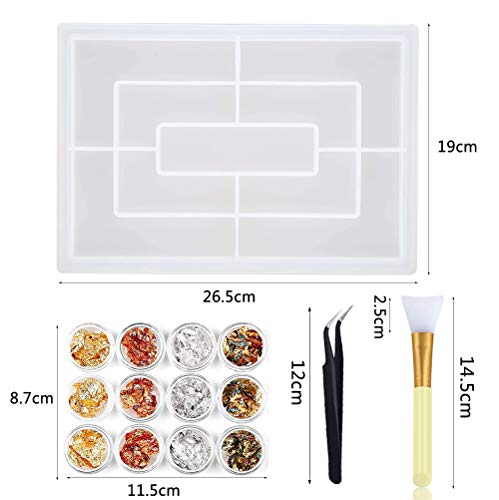 I prodotti includono: 1 stampo in silicone per vassoio in resina, 1 foglia oro con 4 colori, 1 spazzola in silicone e 1 pinzetta. Molto adatto per visualizzare e posizionare i propri accessori. Dimensioni: 26,5 cm x 19 cm. Se si desidera mostrare gioielli o trasferire caffè ad amici o clienti, questo può migliorare in modo più efficace l'aspetto degli oggetti posti sul vassoio.
